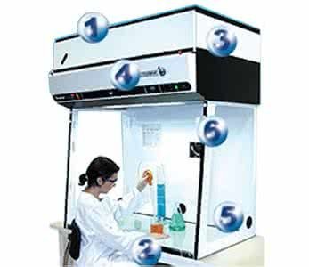 5. 切勿用物件阻挡通风柜口和柜内后方的排气槽;确需在柜内储放必要物品时, 应将其垫高置于左右侧边上,同通风柜台面隔空,以使气流能从其下方通过,且远离污染产生源。