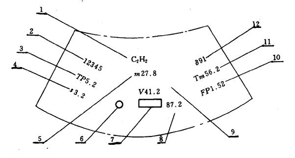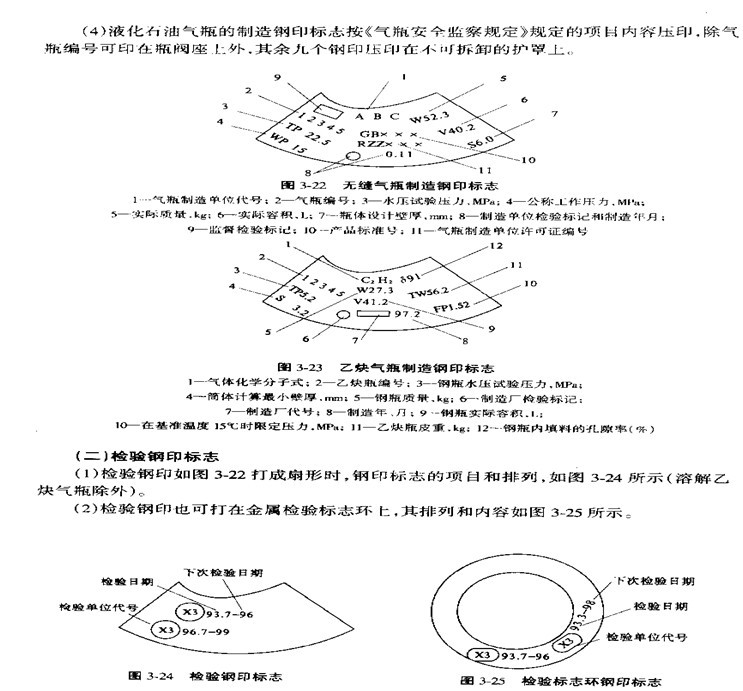1-乙炔化学分子式;2―乙炔瓶编号;3―钢瓶水压试验压力,MPa;4―筒体计算最小壁厚,mm;5―钢瓶质量,kg;6―制造厂检验标记;7―制造厂代号;8―制造年、月;9―钢瓶实际容积,L;10―在基准温度15℃时的限定充装压力,MPa;11―乙炔瓶皮重,kg;12―钢瓶内填料的孔隙率,%.gif